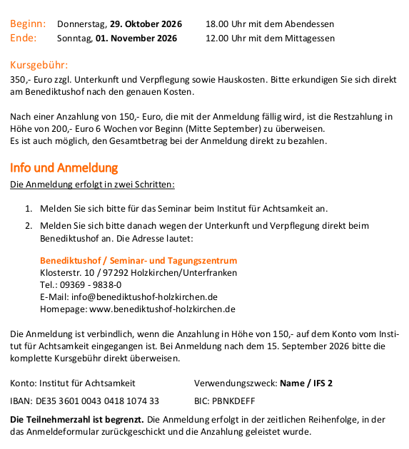 IFS bietet einen innovativen, nicht-pathologisierenden und mitfühlenden Ansatz, um menschliche Probleme klarer zu verstehen und direkt damit zu arbeiten. Das Seminar führt in die Grundlagen des IFS-Modells ein und erkundet besonders seine Anwendung in Verbindung mit Achtsamkeit und Meditation. Durch praktische Übungen, Meditationen und Gruppenarbeit werden wir die Fähigkeit entwickeln, eigene innere Teile zu erkennen, die während der Meditationspraxis oder während des Kursgebens auf mitunter hinderliche Weise auftauchen, um auf geschickte Weise mit ihnen zu interagieren.
